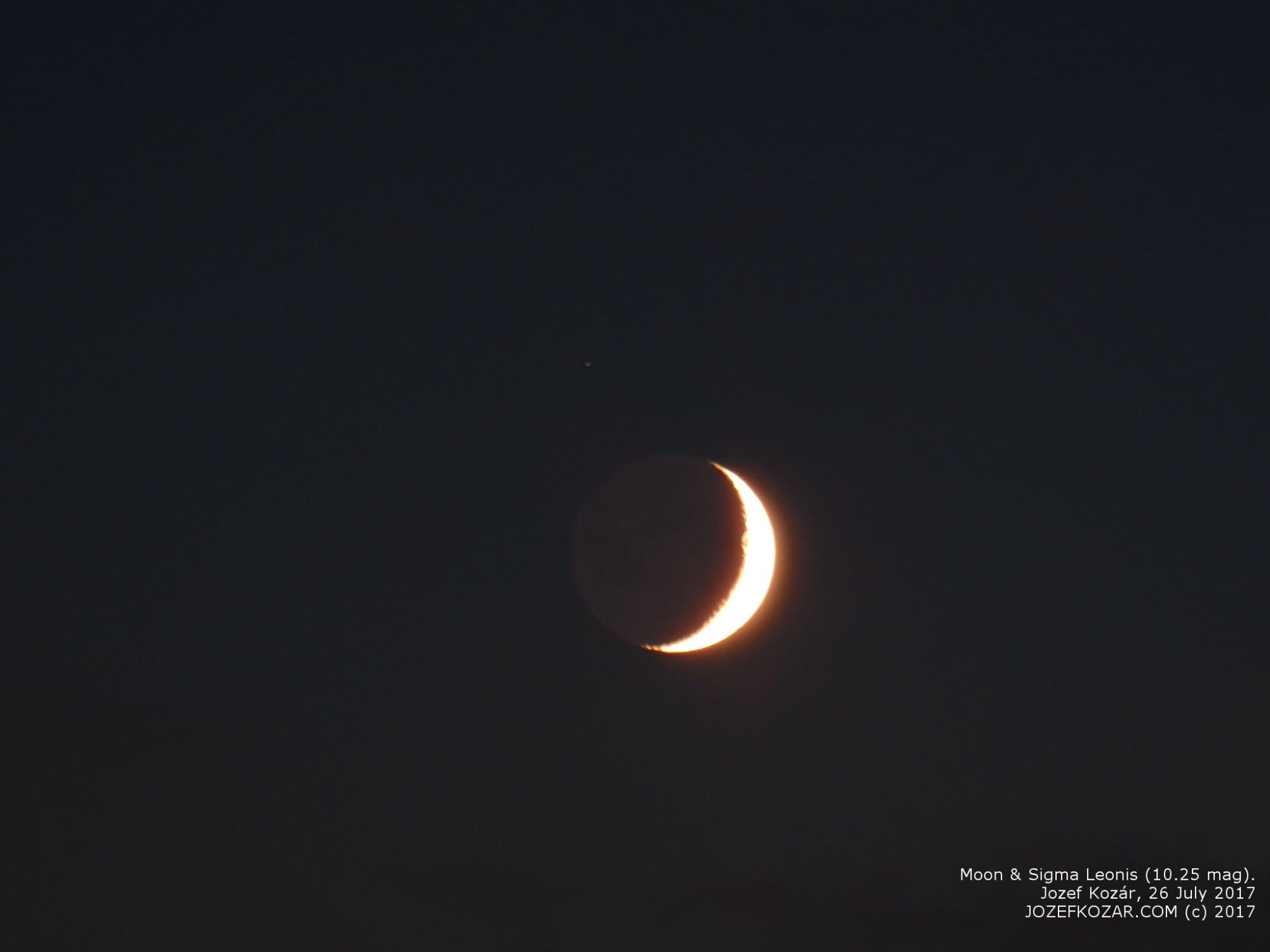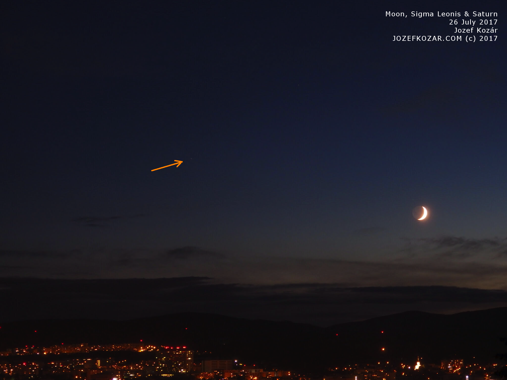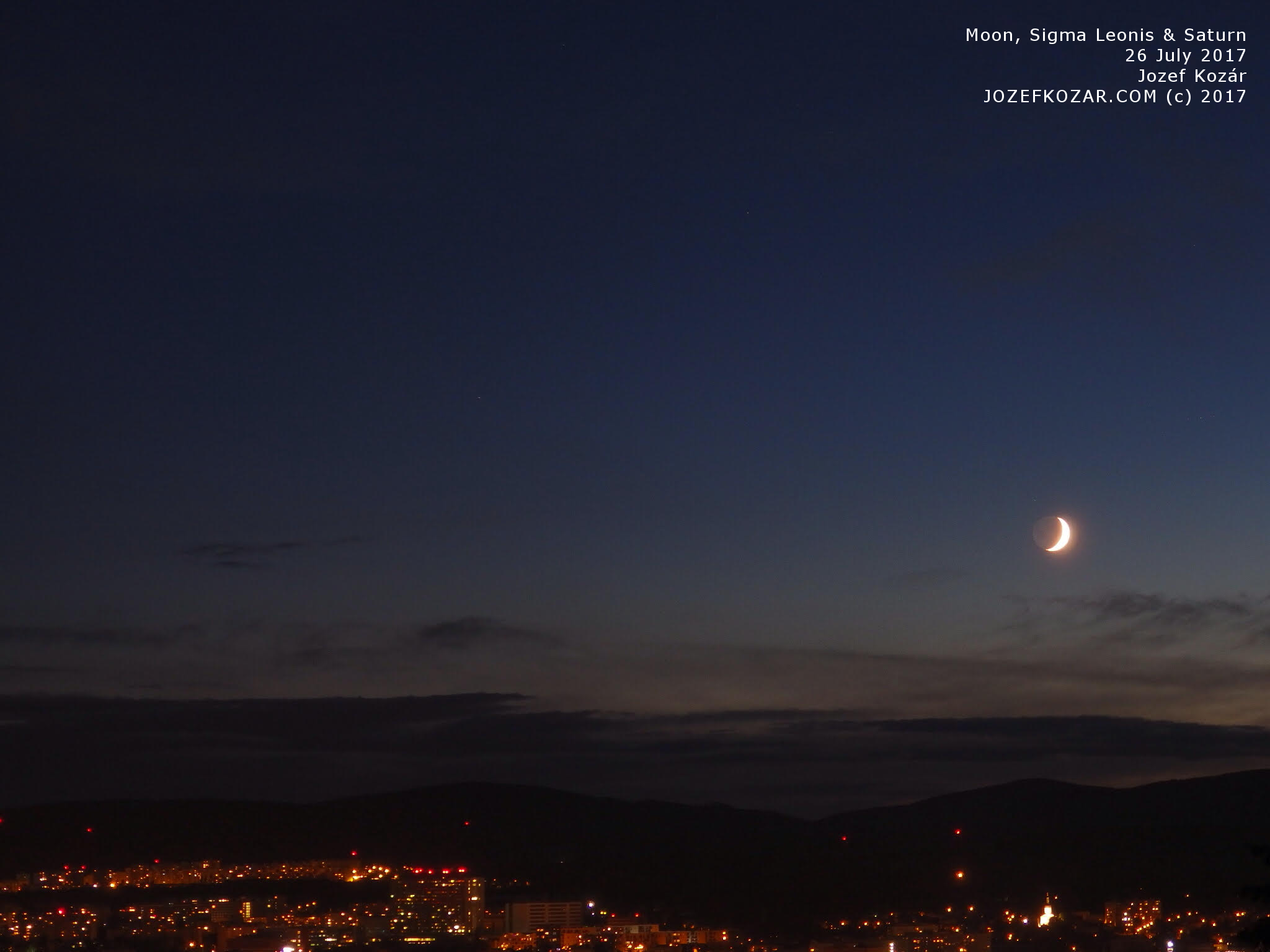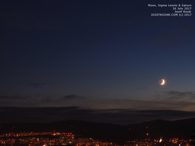 The photo below shows the Moon, star Sigma Leonis and planet Saturn together above the city. Can you see Saturn? Just click on the image, the photo will open in a new window – Saturn is a small dot in the center of the night sky above the city: