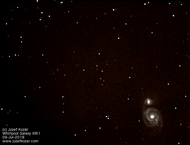 The first image of my observation of M51 Whirlpool Galaxy on Monday (July 09, 2018) this week with one of the robotic telescopes. The image is result of processed stack layers and of the dark calibration in FITS.
