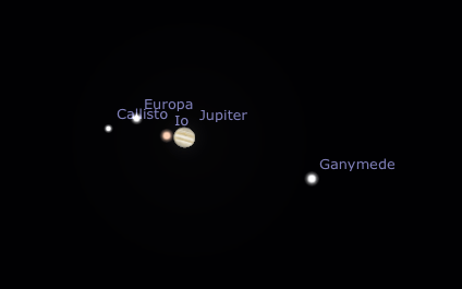 Planet Jupiter can be seen with its moons around. We often call this small planetary system a “small solar system”. Actually this may be a little bit tricky, the truth is that Jupiter is a giant gas planet (very similar to stars!) and the moons orbiting around are rocky moons, many of them spheres.