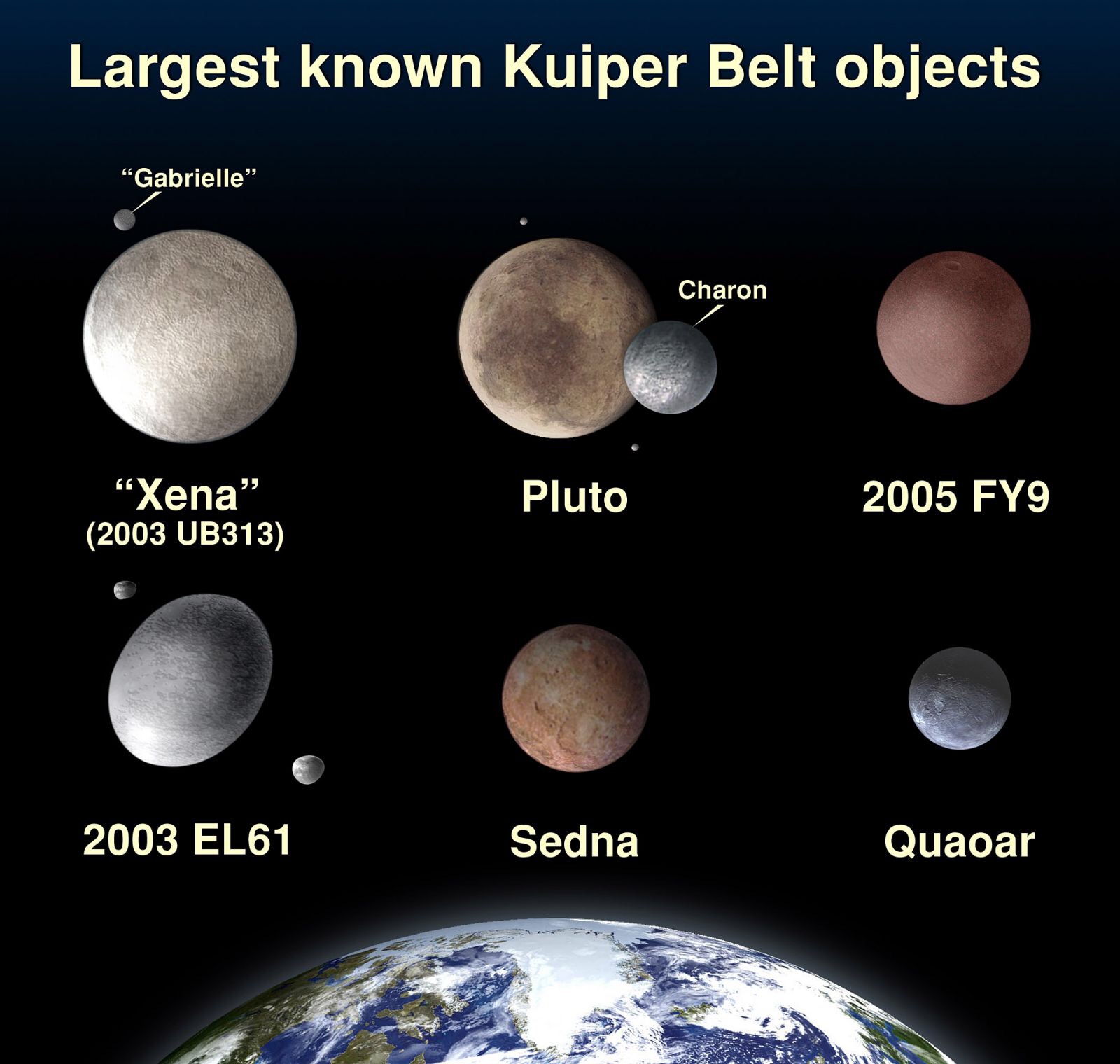 Some of the largest known Kuiper Belt objects – explanation why Pluto isn’t considered as planet anymore.