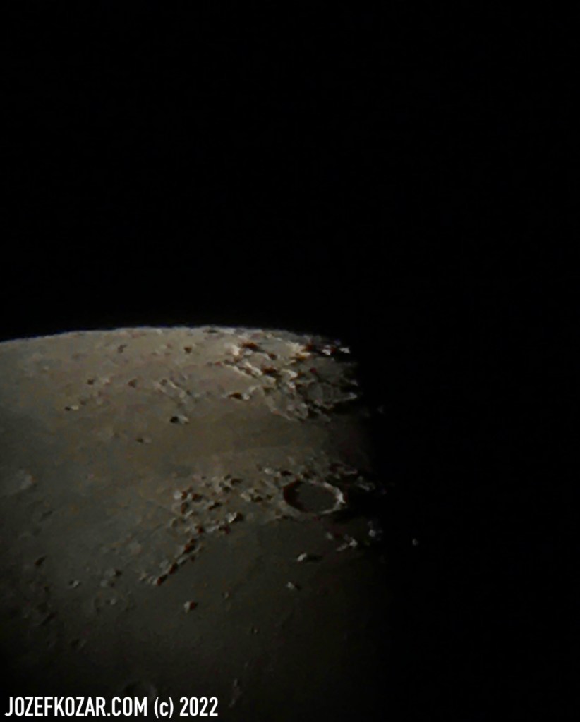 Not very clear photo. I used just my smartphone attached to the eyepiece.The “edge” of the Moon.I used just the 24mm eyepiece. The other eyepieces (4mm and 10mm) I could not use, because the adaptor that I used for attaching the smartphone, did not fit with them. So I could not take better resolution photos and also with better zoom, just because of this. The naked eye view with the other eyepieces was excellent. Okay, I do not mention the disturbing clouds.